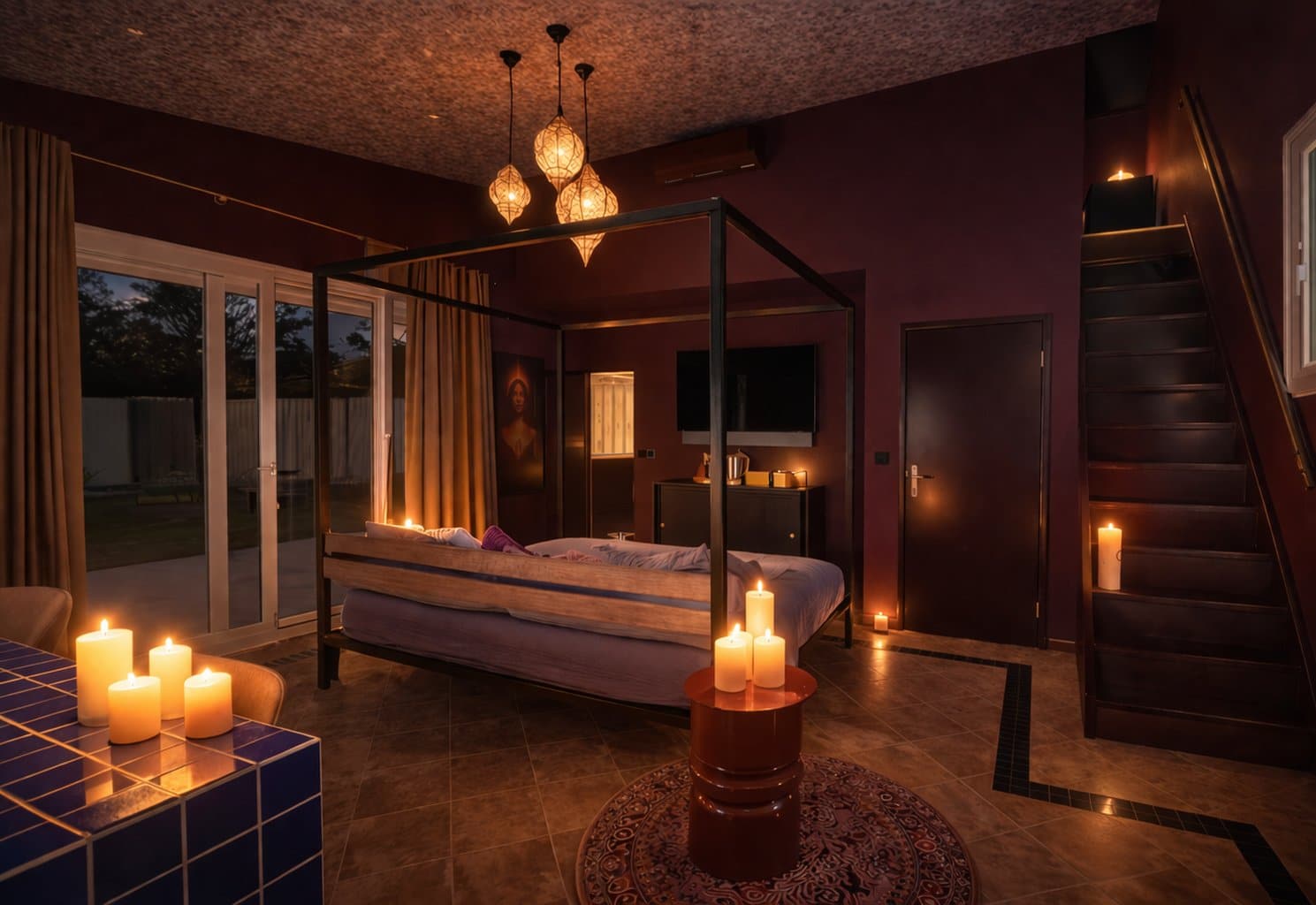 Le Woestijnroos Lodge n'est pas un simple lieu de séjour, mais un univers à part entière, où calme et luxe se marient à merveille. Dès que vous y entrez, des couleurs chaudes et des détails d'inspiration orientale et indienne envahissent vos sens, tandis qu'un sentiment d'intimité s'installe immédiatement. De plus, vous bénéficiez ici d'une intimité totale, ce qui ralentit le temps. Ce lieu caché est situé à proximité de la réserve naturelle des Maasduinen, tandis que Venlo n'est pas loin non plus. Vous combinez ainsi nature et confort, tout en échappant à l'agitation.